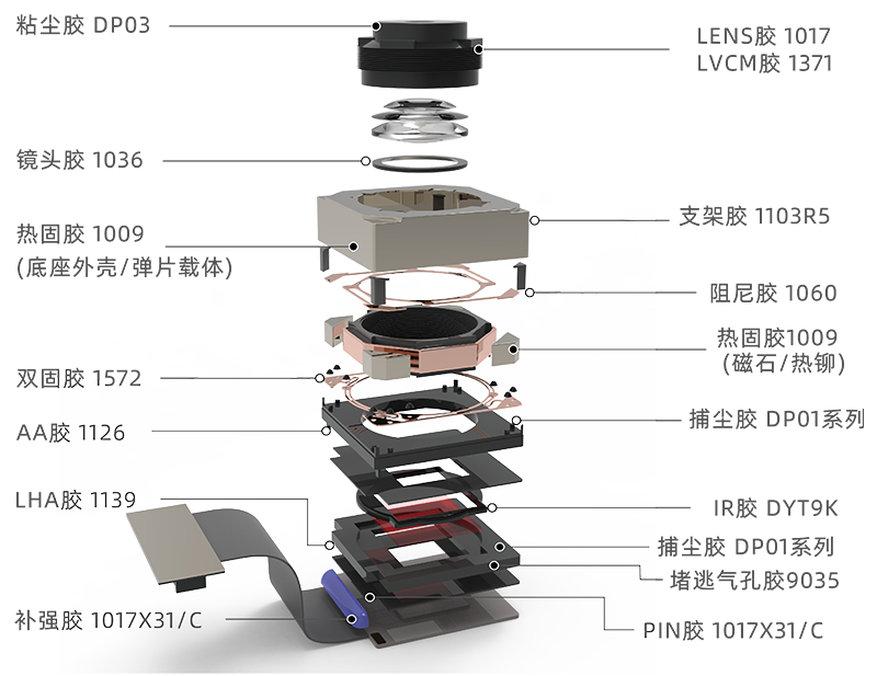 在智能手机摄像模组领域,胶粘剂作为核心组装材料,其性能直接决定成像精度与长期可靠性。随着多摄像头、光学防抖(OIS)、自动对焦(AF)等技术普及,模组对胶粘剂的精密性、环境适应性和生产效率提出更高要求。 昀通科技(Aventk)的 UV 固化胶通过配方的优化,提升对UV光的吸收,在极短时间内可固化完全其快速固化特性配合自动化点胶设备,可实现高效生产。此外,胶粘剂需耐受极端温度波动、高湿度及机械振动,防止元件因热膨胀系数差异开裂。针对金属、塑料、玻璃等复杂界面,胶粘剂需提供优异粘接强度,并通过柔性改性剂缓解应力。昀通科技的低温热固胶在多种材料上表现优异,且支持低温固化,避免高温对元器件的损伤。产品已通过国内头部企业严格测试并量产交付,符合环保标准,推动摄像模组向更高精度、更小尺寸、更优成本的方向发展。
