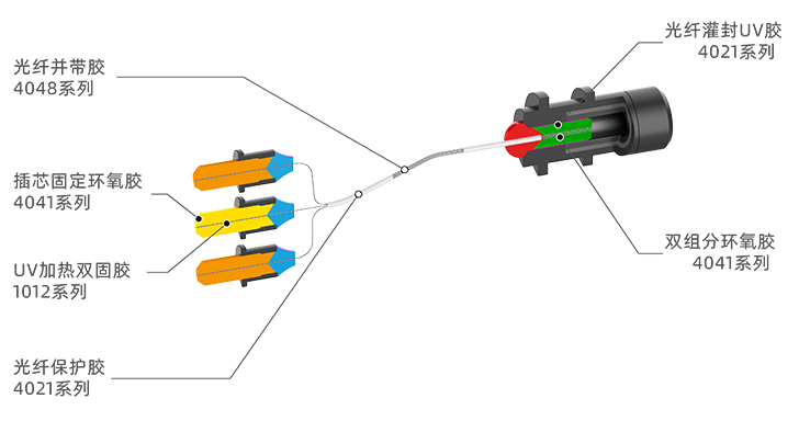 针对无源光器件-陶瓷插芯(Ceramic Ferrule)和光纤跳线(Fiber Optic Patch Cord)的灌封用胶方案,需要满足高精度对位、长期机械稳定性及低光学损耗等核心需求。昀通科技推出用于光纤涂层固化、跳线灌封的单、双组份环氧胶水,满足客户端单/双组分胶水不同点胶作业工艺需求。相对需要按比例混合搅拌且操作繁琐的双组份胶水,昀通推出单组分跳线灌封胶方案4045Y系列,具有良好流淌性能、低温110℃加热固化、高Tg,对光纤、金属、陶瓷和玻璃具有出色的粘接强度等明显优势,能帮助客户实现自动化点胶作业,提高客户生产UPH。此方案已得到行业内多家大型知名光器件厂商的认可并量产。