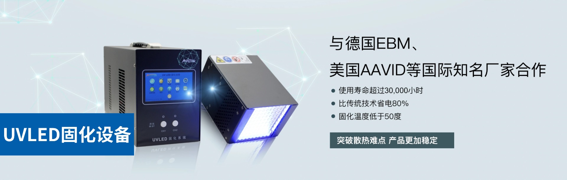 昀通科技(AVENTK)专注UV LED光固化设备的开发和制造,用心倾听客户需求,为客户提供专业和个性化的服务。主营产品:UV LED点光源、UV LED线光源、UV LED面光源、UV LED固化箱、uv固化炉、UV LED传送带固化设备等UV LED固化机,在胶水固化、油墨曝光、油漆干燥等方面得到广泛使用。特别是在医疗、电子装配、扬声器小喇叭、摄像头模组、光纤、印刷包装、喷绘等行业。