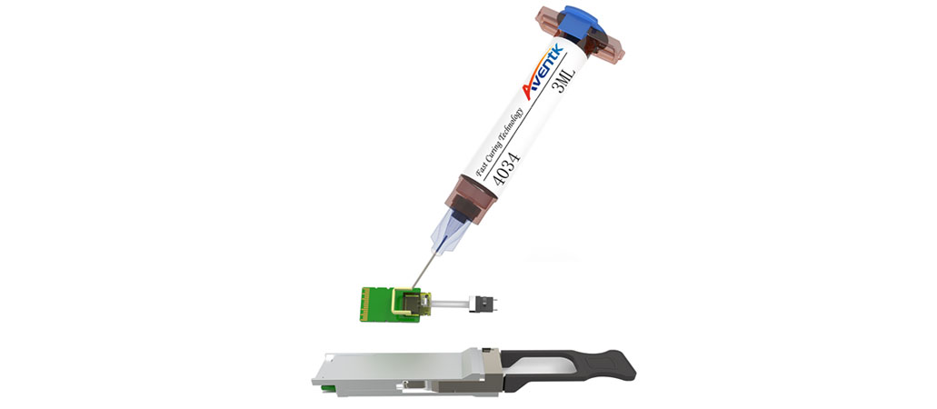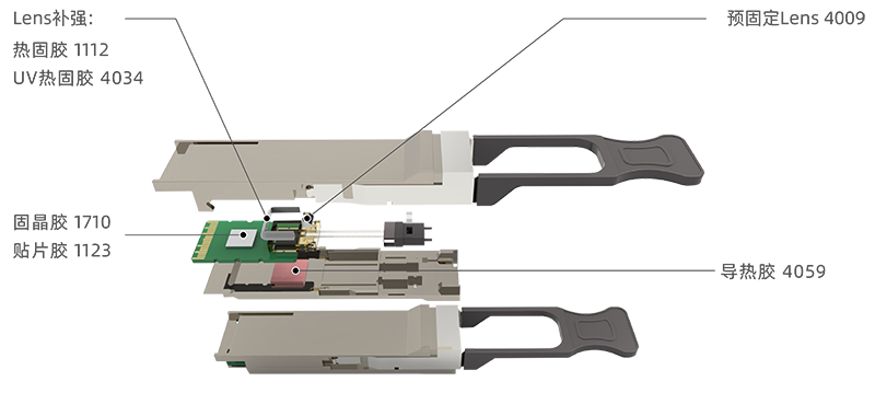 针对光模块的用胶方案需满足高可靠性、信号完整性及复杂环境适应性要求。昀通科技依靠高可靠性的光通讯用胶技术平台,推出了一系列高可靠性的光模块用胶方案。在高速光模块方面, 推出应用于数据中心400G/800G光模块COB封装的透镜精密耦合固定的UV热双固胶(4034系列),该系列产品在国内光通信头部客户量产多年,可以替代国外同类应用产品。4034系列产品是单组份环氧阳离子体系的UV加热双固胶水,具有UV快速定位固定、热固化补强、低收缩率、应力低避免开裂失效等特性,该系列具有良好的粘接强度和可靠性,确保胶水与器件结合牢固,且长期保持物理化学性能稳定,延长光模块或器件使用寿命,减少模块维护和更换成本。